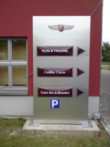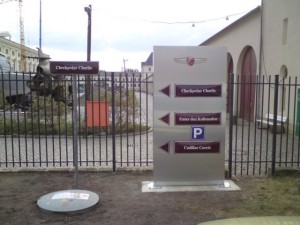 Montage von Beschilderungen im Gelände der Zeitenströmung in Dresden, Königsbrücker Strasse