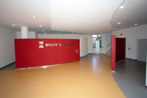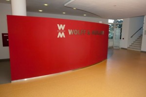Neubau von freistehenden Rundwänden und eines Deckensegels im Foyer der Niederlassung von Wolff & Müller in Dresden